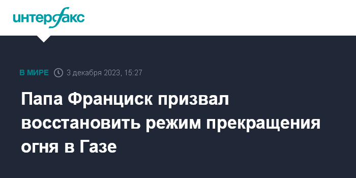 Москва. 3 декабря. INTERFAX.RU - Папа Римский Франциск в воскресенье обратился ко всем, кто имеет отношении к ситуации в секторе Газа, с призывом возобновить режим прекращения огня, сообщают западные СМИ.