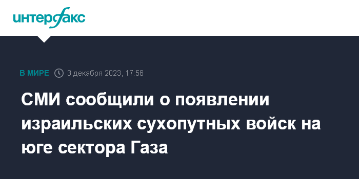 Москва. 3 декабря. INTERFAX.RU - Сухопутные войска Израиля, возможно, проводят операции в южной части сектора Газа, сообщает The Times of Israel.