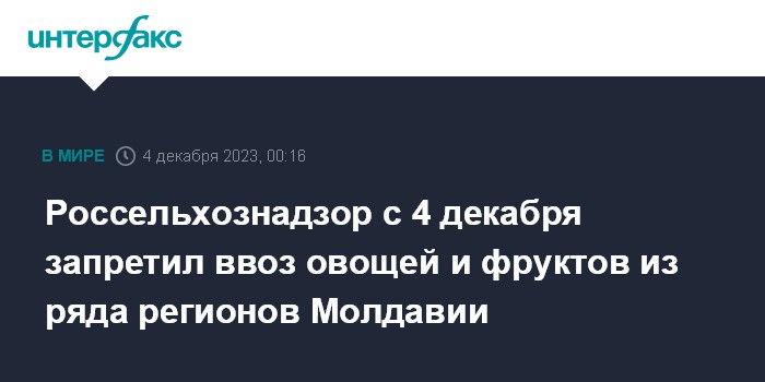 Москва. 4 декабря. INTERFAX.RU - Россельхознадзор с 4 декабря запретил ввоз овощей и фруктов (подкарантинная продукция) из ряда регионов Молдавии.
