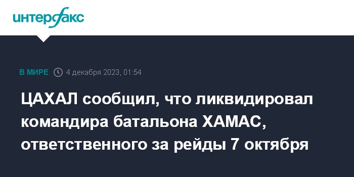 Москва. 4 декабря. INTERFAX.RU - Армия обороны Израиля заявила, что ликвидировала командира батальона "Шати" палестинского движения ХАМАС, который командовал рейдами движения на территории страны 7 октября.
