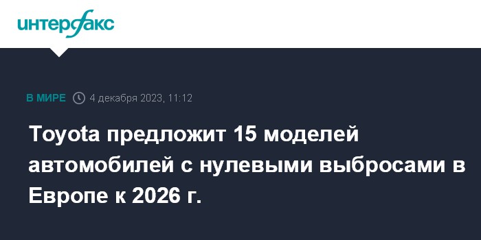 Москва. 4 декабря. INTERFAX.RU - Toyota Motor будет предлагать 15 моделей автомобилей с нулевыми выбросами в Европе к 2026 году – от легковых машин до легких грузовиков, говорится в сообщении компании.