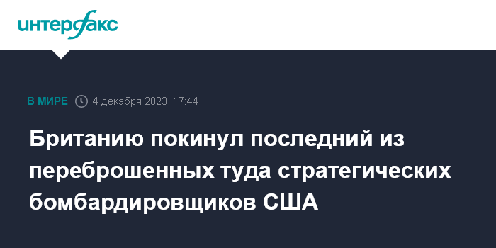 Москва. 4 декабря. INTERFAX.RU - Последний из четырех американских стратегических бомбардировщиков B-1B Lancer, временно размещенных в октябре на британской авиабазе Фэрфорд в графстве Глостершир в Англии, 4 декабря вылетел обратно в США, сообщила новостная служба Gloucestershire Live.