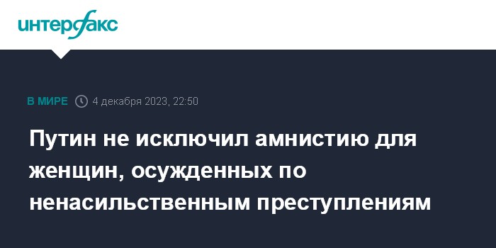 Москва. 4 декабря. INTERFAX.RU - Президент РФ Владимир Путин не исключил амнистию для женщин, которые осуждены и находятся под следствием по ненасильственным преступлениям, пообещав принять решение по этому вопросу.