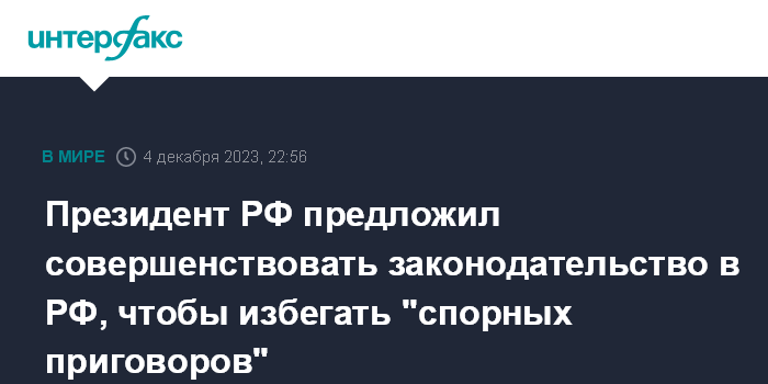 Москва. 4 декабря. INTERFAX.RU - Президент РФ Владимир Путин предложил совершенствовать законодательство и правоприменительную практику в РФ с тем, чтобы избегать "спорных приговоров", избыточно жестокого наказания за несущественные, ненасильственные преступления.