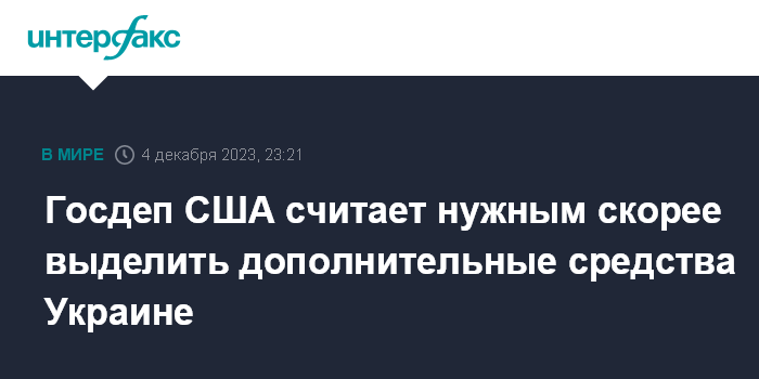 Москва. 4 декабря. INTERFAX.RU - В Госдепе США полагают, что Конгрессу необходимо как можно быстрее выделить дополнительные средства для финансирования дальнейшей помощи Украине, заявил в понедельник представитель американского внешнеполитического ведомства Мэтью Миллер.