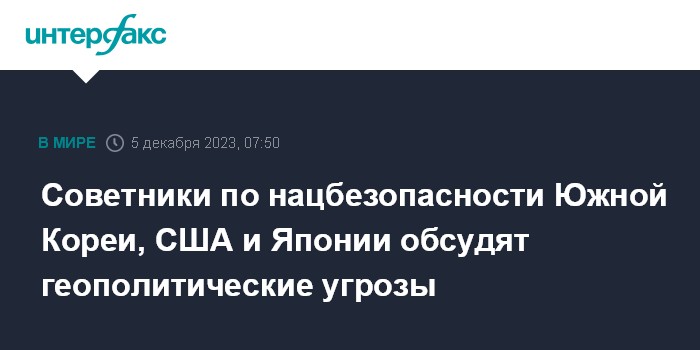 Москва. 5 декабря. INTERFAX.RU - Советники по национальной безопасности Южной Кореи, США и Японии встретятся в Сеуле на этой неделе, чтобы обсудить совместные меры реагирования на региональные геополитические риски, включая северокорейские угрозы, сообщает информационное агентство "Ренхап".
