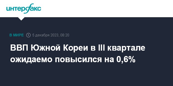 Москва. 4 декабря. INTERFAX.RU - Экономика Южной Кореи в третьем квартале 2023 года увеличилась на 0,6% относительно предыдущих трех месяцев, согласно окончательным данным Банка Кореи.