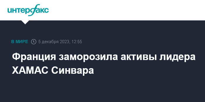 Москва. 5 декабря. INTERFAX.RU - Франция объявила о замораживании авуаров лидера радикального движения ХАМАС в Газе Яхьи Синвара, передает телеканал BFMTV.