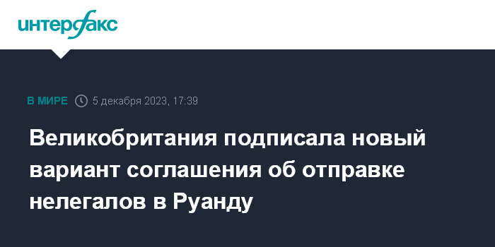 Москва. 5 декабря. INTERFAX.RU - Министр внутренних дел Великобритании Джеймс Клеверли в ходе визита в Кигали подписал новый вариант соглашения с Руандой, предусматривающий отправку в эту африканскую страну попавших на британскую территорию нелегальных иммигрантов, желающих получить убежище, сообщает телеканал Sky News.