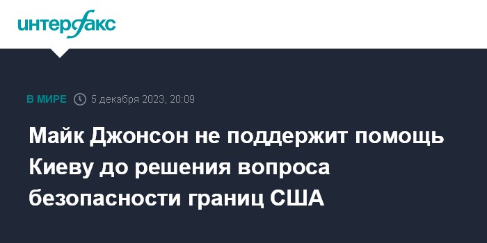 Москва. 5 декабря. INTERFAX.RU - Спикер Палаты представителей Конгресса США Майк Джонсон направил в Белый дом письмо, в котором указал, что не будет поддерживать выделение новой помощи Украине, пока не будет изменен подход к мерам безопасности на американских границах. Письмо он опубликовал в своем микроблоге.