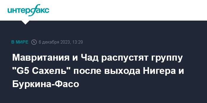 Москва. 6 декабря. INTERFAX.RU - Мавритания и Чад объявили о том, что задействуют механизм, позволяющий распустить группу "G5 Сахель", координировавшую борьбу против радикальных группировок.