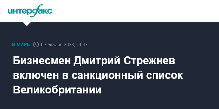 Москва. 6 декабря. INTERFAX.RU - Российский бизнесмен Дмитрий Стрежнев с 6 декабря включен в санкционный список Великобритании, следует из официальной публикации на сайте правительства страны.