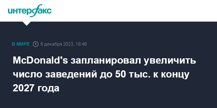 Москва. 6 декабря. INTERFAX.RU - Американская McDonald's Corp. планирует увеличить число ресторанов быстрого обслуживания по всему миру до 50 тыс. к концу 2027 года.