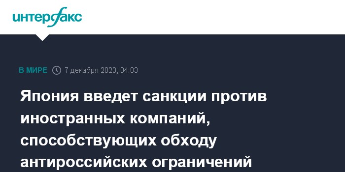 "Премьер-министр (Фумио - ИФ) Кисида сообщил, что в дополнение к санкциям в отношении российских физических и юридических лиц, к концу года планируется определить, какие организации из третьих стран, подозреваемые в причастности к обходу этих мер, будут также повергнуты санкционному давлению", - говорится в сообщении МИД Японии.