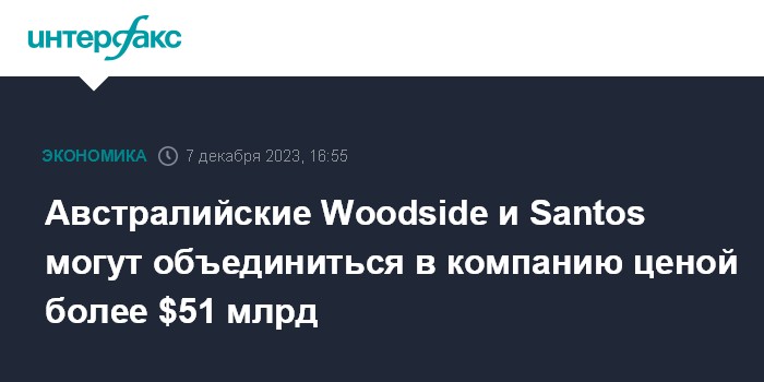Москва. 7 декабря. INTERFAX.RU - Австралийские нефтегазовые Woodside Energy и Santos ведут переговоры о слиянии, говорится в сообщениях этих компаний.