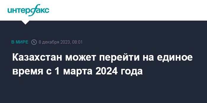 Москва. 8 декабря. INTERFAX.RU - Единый часовой пояс в Казахстане может быть установлен с 1 марта 2024 года. Соответствующий проект постановления правительства опубликован на сайте министерства торговли и интеграции республики.