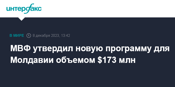 Москва. 8 декабря. INTERFAX.RU - Исполнительный совет Международного валютного фонда (МВФ) утвердил новую программу с Молдавией объемом $173 млн через механизм RSF (финансирование для достижения стойкости и долгосрочной устойчивости), сообщила пресс-служба МВФ.