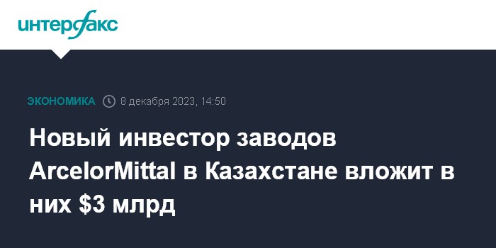 Казахстанский госфонд прямых инвестиций выкупил 100% "АрселорМиттал Темиртау" за $286 млнЧитать подробнее"Qazaqstan Steel Group в лице казахстанского бизнесмена Андрея Лаврентьева достигнуты договоренности с министерством промышленности и строительства Республики Казахстан о приобретении активов ArcelorMittal Temirtau (и трубного завода ArcelorMittal в Актау - ИФ) (...). Инвестор берет на себя обязательства по инвестированию более $3 млрд, из которых уже в следующем году будет вложено $1,3 млрд", - отмечает компания.