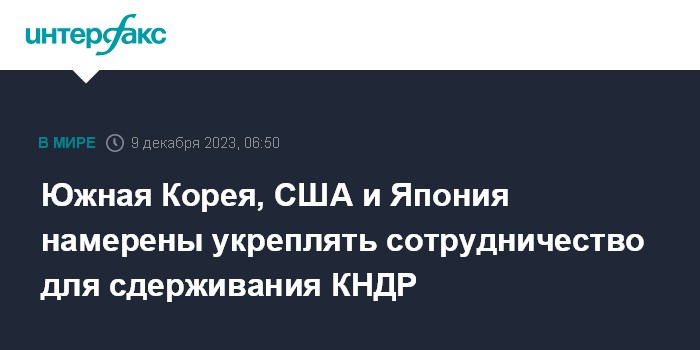 Москва. 9 декабря. INTERFAX.RU - Южная Корея, США и Япония будут укреплять взаимодействие в области безопасности, в частности, в борьбе с ядерными и ракетными угрозами Северной Кореи, сообщило агентство "Ренхап" по итогам переговоров в Сеуле советников руководителей трех стран по вопросам нацбезопасности.