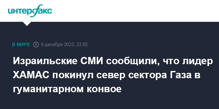 Израильские СМИ сообщили, что лидер ХАМАС покинул север сектора Газа в гуманитарном конвое