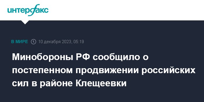 Минобороны РФ сообщило о постепенном продвижении российских сил в районе Клещеевки