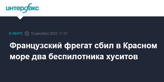 Москва. 10 декабря. INTERFAX.RU - Фрегат ВМС Франции Languedoc, патрулирующий Красное море, в ночь на воскресенье отразил атаку двух дронов, запущенных против него с подконтрольной хуситам территории на севере Йемена, сообщает Le Figaro со ссылкой на французский генштаб.
