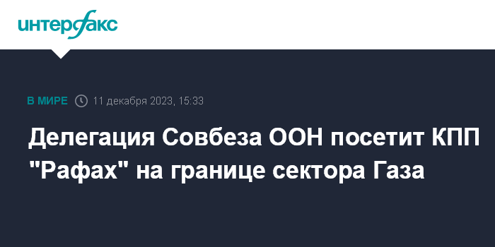 Москва. 11 декабря. INTERFAX.RU - Делегация представителей стран - членов Совета безопасности ООН прибыла в египетский город Эль-Ариш, откуда рассчитывает направиться к КПП "Рафах", через который доставляется гуманитарная помощь в сектор Газа, сообщает агентство EFE.