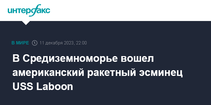Москва. 11 декабря. INTERFAX.RU - Американский ракетный эсминец USS Laboon в понедельник, пройдя пролив Гибралтар, вошел в Средиземное море, сообщил 6-й оперативный флот США.