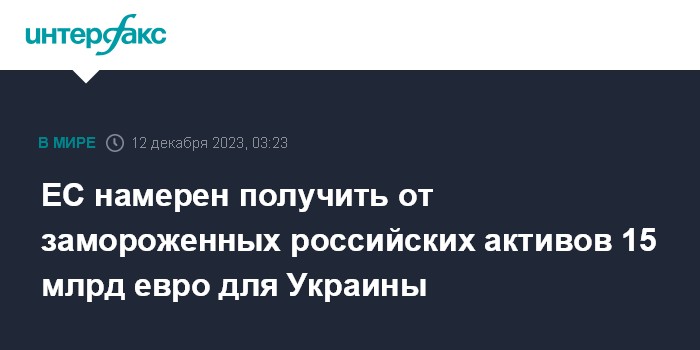 Москва. 12 декабря. INTERFAX.RU - Еврокомиссия планирует собрать 15 млрд евро для помощи Украине из доходов от замороженных в Евросоюзе российских активов, сообщает Financial Times.