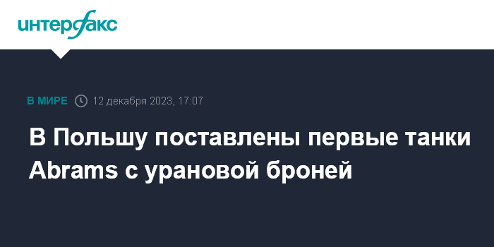 Москва. 12 декабря. INTERFAX.RU - Польшу поставлены первые танки Abrams с урановой броней, сообщил государственный оборонный концерн Польши PGZ.