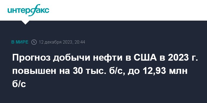 Москва. 12 декабря. INTERFAX.RU - Минэнерго США повысило прогноз добычи нефти в стране (без учета других жидких углеводородов) на 2023 год с 12,9 млн б/с до 12,93 млн б/с, говорится в ежемесячном прогнозе управления энергетической информации (EIA) ведомства.