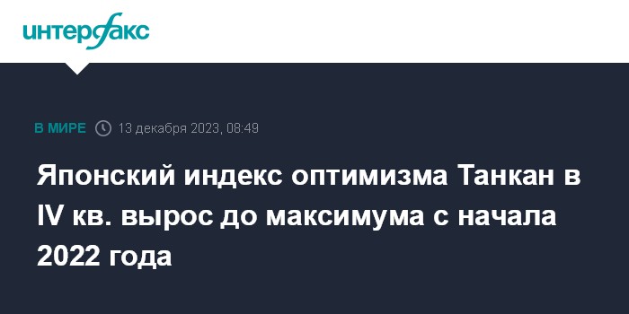Москва. 13 декабря. INTERFAX.RU - Индекс Танкан, оценивающий уровень доверия к экономике Японии среди крупных компаний перерабатывающей промышленности, вырос в четвертом квартале до 12 пунктов - максимума с января-марта 2022 года, говорится в сообщении Банка Японии.