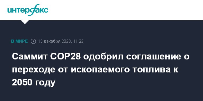 Москва. 13 декабря. INTERFAX.RU - Страны-участницы климатического саммита COP28 в среду одобрили без возражений итоговый документ, предложенный Объединенными Арабскими Эмиратами и призывающий к переходу от использования ископаемого топлива к 2050 году.