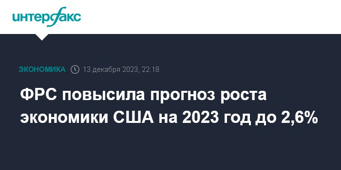 Москва. 13 декабря. INTERFAX.RU - Федеральная резервная система (ФРС) повысила прогноз роста экономики США на 2023 год до 2,6% с ожидавшихся в сентябре 2,1%, ухудшив при этом прогноз на 2024 год - до 1,4% с 1,5%.