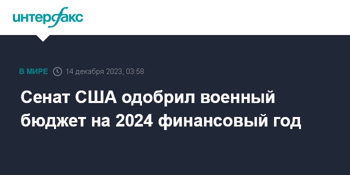 Москва. 14 декабря. INTERFAX.RU - Сенат Конгресса США большинством голосов одобрил оборонный бюджет страны на 2024 финансовый год, известный также как закон о национальной обороне, сообщают СМИ со ссылкой на итоги голосования.