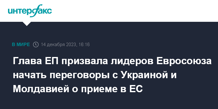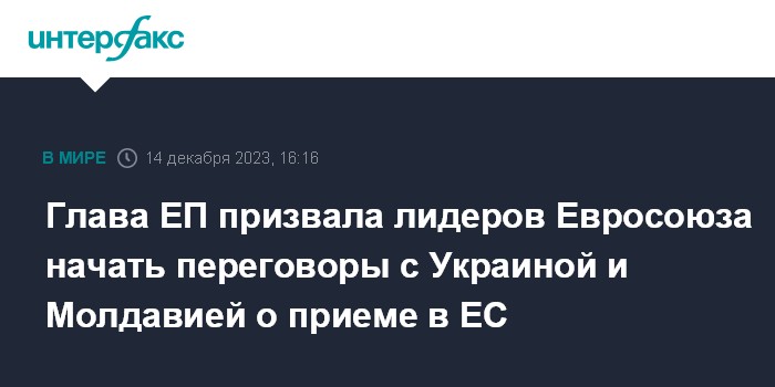 Москва. 14 декабря. INTERFAX.RU - Председатель Европейского парламента (ЕП) Роберта Метсола заявила на саммите ЕС, что Украина и Молдавия выполнили необходимые критерии для начала переговоров о вступлении в Евросоюз.
