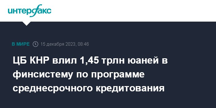 Москва. 15 декабря. INTERFAX.RU - Народный банк Китая (НБК, центробанк страны) в пятницу влил в финансовую систему 1,45 трлн юаней ($204 млрд) в рамках программы среднесрочного кредитования (MLF).