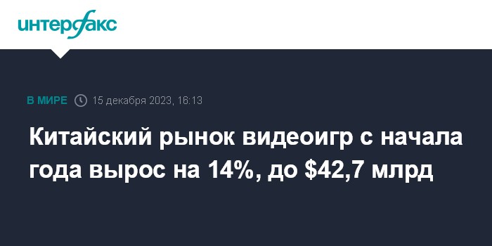 Москва. 15 декабря. INTERFAX.RU - Выручка от продажи видеоигр в Китае с начала 2023 года достигла 303 млрд юаней ($42,7 млрд), увеличившись на 14% в годовом выражении, пишет агентство "Синьхуа" со ссылкой на доклад, представленный на отраслевой конференции в пятницу.
