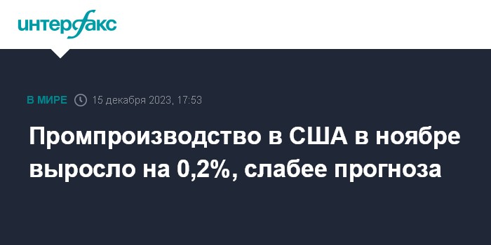 Москва. 15 декабря. INTERFAX.RU - Объем промышленного производства в США в ноябре вырос на 0,2% по сравнению с предыдущим месяцем, сообщила Федеральная резервная система.