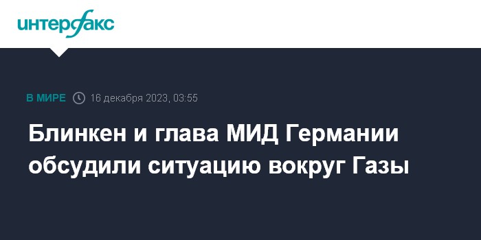 Москва. 16 декабря. INTERFAX.RU - Госсекретарь США Энтони Блинкен в телефонной беседе с министром иностранных дел Германии Анналеной Бербок приветствовал поддержку руководством ФРГ права Израиля на то, чтобы "гарантировать, что ХАМАС никогда не сможет повторить теракты 7 октября", сообщил американский госдеп.