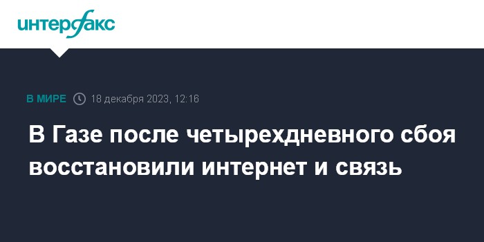 Москва. 18 декабря. INTERFAX.RU - В секторе Газа удалось восстановить системы связи и подключение к интернету после четырех дней отсутствия доступа к ним в анклаве, передает в понедельник издание ОАЭ The National.