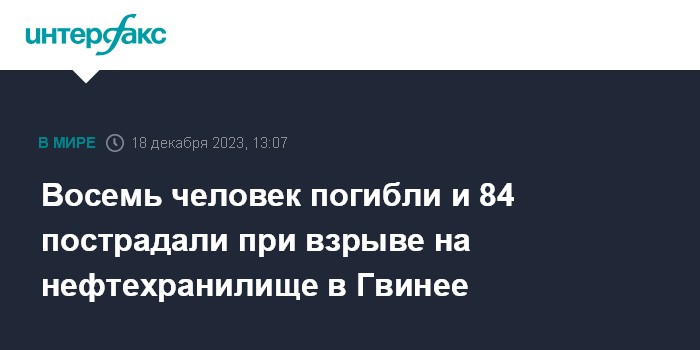 Москва. 18 декабря. INTERFAX.RU - По меньшей мере восемь человек погибли и 84 получили ранения в результате взрыва на нефтяном терминале в столице Гвинеи городе Конакри, сообщают западные СМИ.