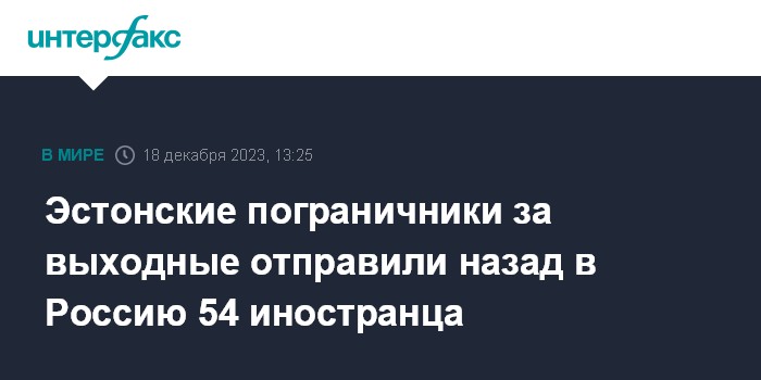 Москва. 18 декабря. INTERFAX.RU - В минувшие выходные эстонские пограничники на пограничном переходе "Нарва" не пропустили в республику 54 иностранца и отправили их обратно в Россию, сообщила пресс-служба Восточной префектуры.