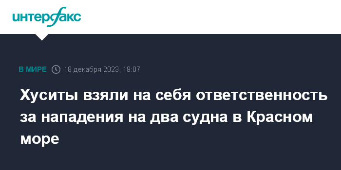 Москва. 18 декабря. INTERFAX.RU - Йеменские повстанцы-хуситы взяли на себя ответственность за удары по танкеру и контейнеровозу, связанным с Израилем, в районе Красного моря, передает EFE.