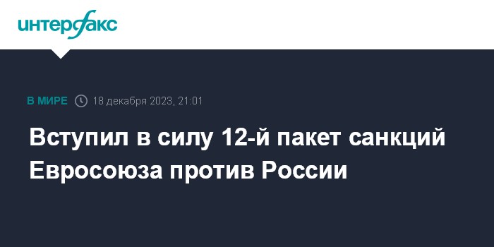 Москва. 18 декабря. INTERFAX.RU - Новый, 12-ый по счету пакет санкций Евросоюза, разработанных против России, опубликован в Официальном журнале ЕС.