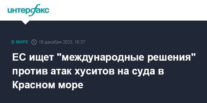 Москва. 19 декабря. INTERFAX.RU - ЕС осуждает атаки йеменских хуситов на суда в Красном море, нарушающие международное право, и ведет поиск "международного решения" против этих действий, сообщил Петер Стано, пресс-секретарь главы дипломатии ЕС Жозепа Борреля.