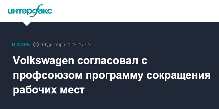 Москва. 19 декабря. INTERFAX.RU - Германский автопроизводитель Volkswagen AG (VW) согласовал c профсоюзом трехлетнюю программу оптимизации расходов, предусматривающую сокращение рабочих мест.