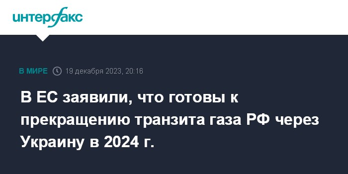Москва. 19 декабря. INTERFAX.RU - ЕС готов к тому, что в конце 2024 года прекратит свое действие контракт на транзит российского газа через территорию Украины, заявила член Еврокомиссии (ЕК) по энергетике Кадри Симсон.