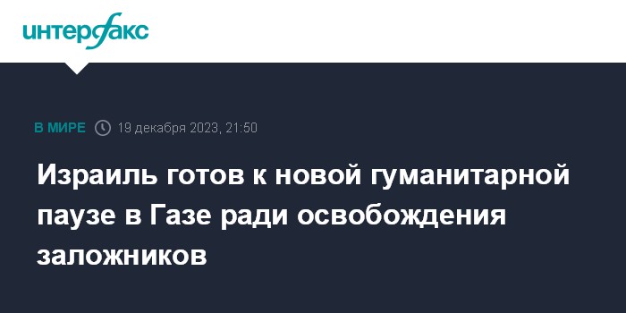 Москва. 19 декабря. INTERFAX.RU - Израиль выражает готовность к очередной гуманитарной паузе в секторе Газа в обмен на освобождение ХАМАСом израильских заложников, сообщает The Jerusalem Post со ссылкой на заявление президента страны Ицхага Герцога.