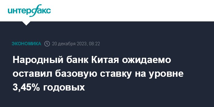 Москва. 20 декабря. INTERFAX.RU - Народный банк Китая (НБК, центробанк страны) сохранил базовую процентную ставку по кредитам (LPR) сроком на один год на уровне 3,45% годовых, что является рекордным минимумом.